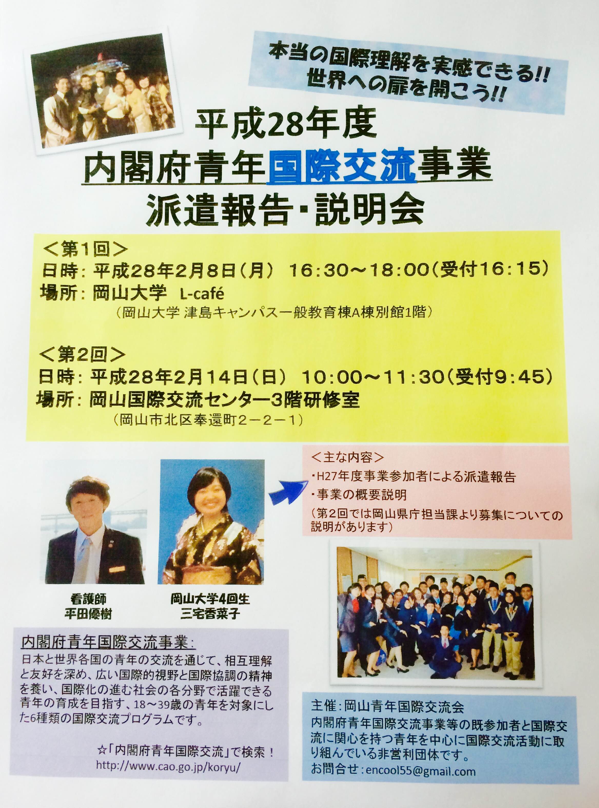 内閣府青年国際交流事業の平成27年度の帰国報告&平成28年度の事業説明会が2回あります(内容同じ)。